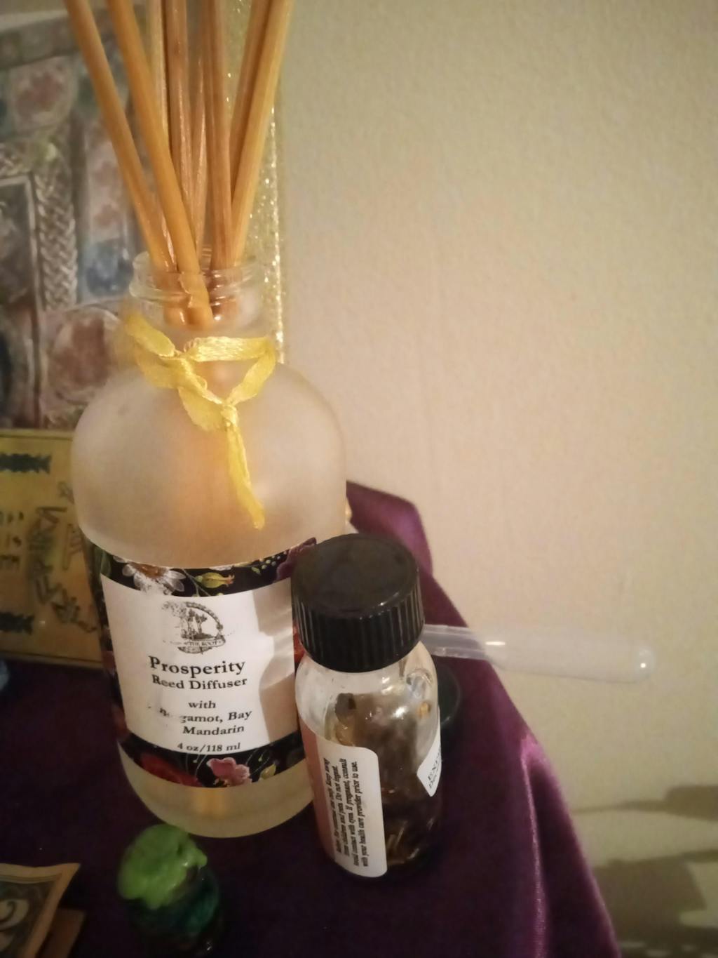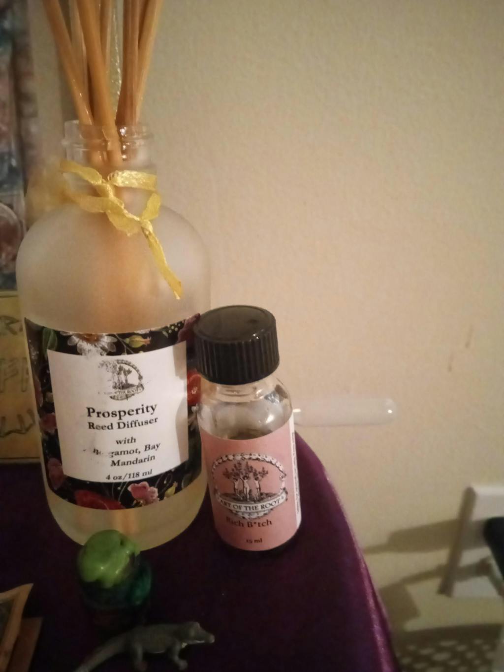 Rich B*tch Oil can be anointed on talismans, coins, or even your favorite piece of jewelry. Add a couple of drops to a bath or simply place a few drops in the heel of your shoe. Cut out pictures of all the items you desire and anoint them with some Rich B*tch Oil and place them in your wallet or purse. Place a few drops on a photograph of yourself and put it in a glitzy frame. Anoint a few drops on a dollar bill or silver dime and carry it in your pocket. Anoint your door keys and rub some on your front door. Add a few drops to a gallon of warm water and wash down your floors and furniture. Simmer some fresh orange peel and bay leaves in 2 cups of water. When it cools, add 10 drops of Rich Bitch Oil. Place the mixture in a spray bottle and spray throughout the home.